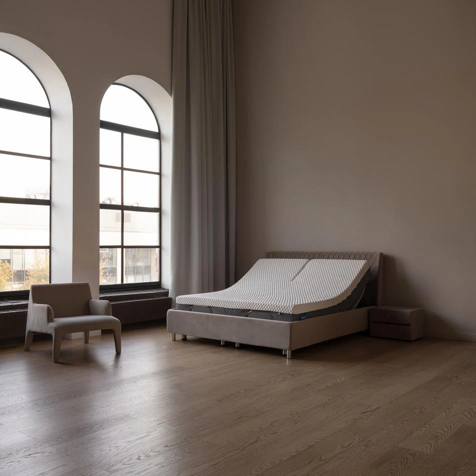 Jedinstvena fleksibilna osnova Ergomotion 633 - nezamenljiv luksuz za svakoga ko ceni komfornu regeneraciju. Pomoći će Vam da odaberete udoban položaj za zdrav san i odmor, eliminisaće napetost mišića posle napornog dana i smanjiće fizičku nelagodu. Sa Ergomotion 633 je udobno raditi od kuće - poseduje dodatnu punkciju pridizanja glave. Fleksibilna osnova je nezamenljiva za ljude koji provode mnogo vremena u putu. Plemenita siva boja "kreveta iz budućnosti" stvoriće atmosferu koja doprinosi harmoniji, uneće notu elegancije i udobnosti u enterijer. Funkcije: Bežično upravljanje; "Transform" - mogućnost odabira udobnog položaja za spavanje, odmor ili rad; "Relaks" - "bestežinski" položaj: kada se noge nalaze iznad nivoa srca, što doprinosi komforu i opuštanju; "Antihrkanje" - uzglavlje koje je pridignuto na 7 stepeni služi za prevenciju hrkanja; "Režim čitanja": napravljen je dodatni motor za podizanje glave - radi čitanja ili rada u komforu; Masaža: nekoliko zona i intenziteta. LED osvetljenje po obodu će vam omogućiti da ne uključujete glavno svetlo noću, kao i da radite ili se bezbedno krećete po sobi bez ometanja sna Vašeg partnera; Tajmer.