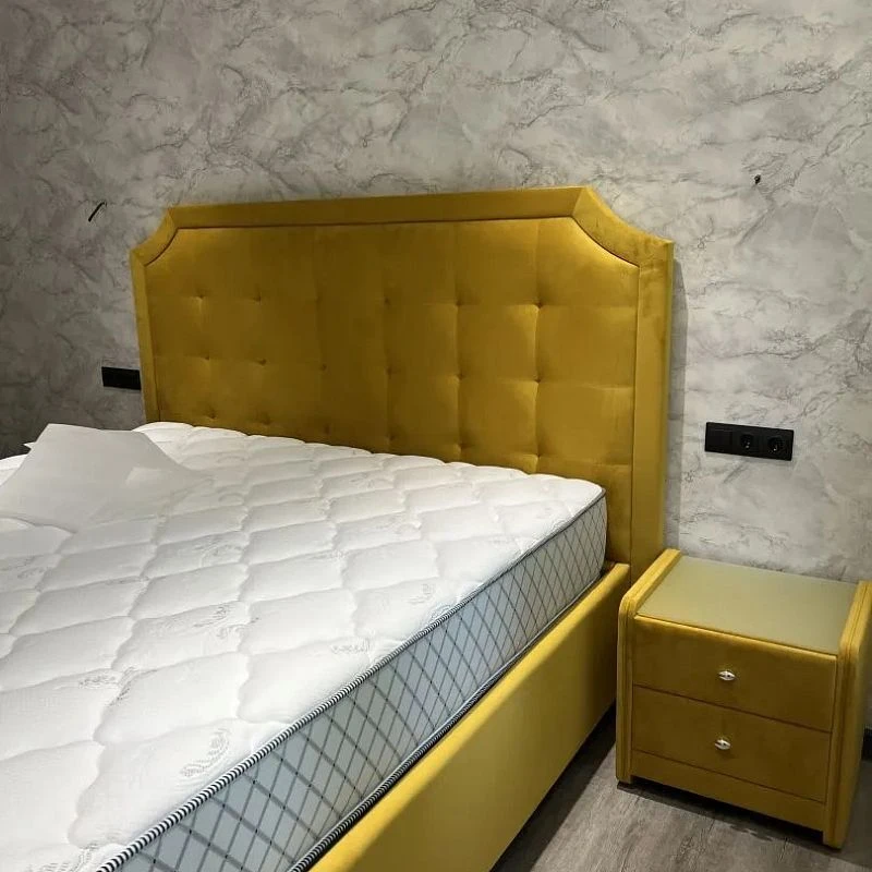 Высокая спинка кровати с мягкими утяжками обрамлена массивной фигурной рамой, которая буквально притягивает взгляд, подчеркивая изысканный стиль комнаты. Возможность выбора расцветки обивочного материала дает простор фантазии для оформления Вашей спальни.